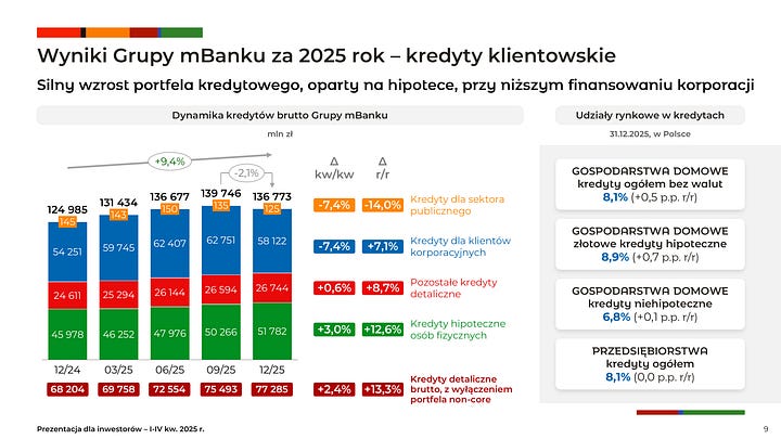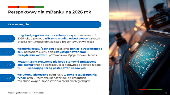 mBank omówił wyniki za 4Q25 i cały 2025 r. oraz przedstawił założenia na 2026 r. Kluczowe osie konferencji to utrzymanie wysokiej rentowności przy niższych stopach procentowych, dalsze ograniczanie ryzyka portfela CHF oraz wzrost wolumenów biznesowych powyżej rynku. W sesji Q&A istotnie wybrzmiały też wątki prawno-regulacyjne typowe dla banków: sankcja kredytu darmowego (SKD), transakcje nieautoryzowane, kapitał regulacyjny, jakość aktywów i wrażliwość NII na kolejne cięcia stóp. [1][2][3]