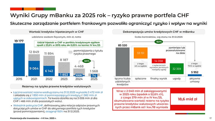 Drugi kluczowy filar to ryzyko prawne kredytów walutowych (CHF i inne waluty). Koszt ryzyka prawnego FX spadł r/r (w 2025: 2,04 mld PLN vs 4,31 mld PLN w 2024), a liczba ugód rosła. Jednocześnie utrzymano konserwatywną kalibrację modelu prawnego i szeroko opisano niepewności orzecznicze oraz legislacyjne. Na konferencji wskazano, że trend kosztów CHF jest korzystny i 2025 ma być ostatnim rokiem z tak istotnym obciążeniem, choć nadal jest to obszar modelowy i wrażliwy na założenia. [1][2][3]