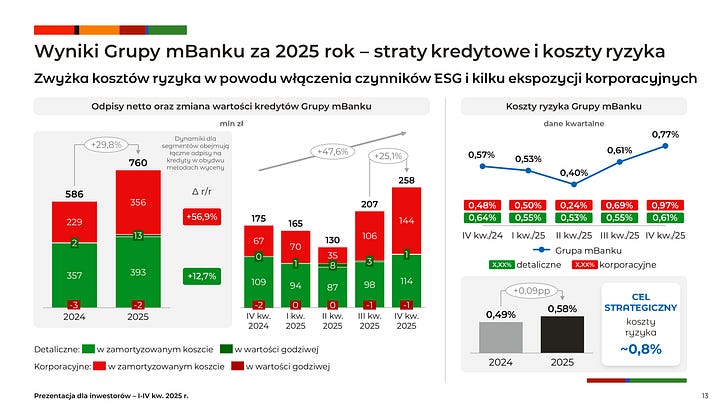 W jakości aktywów podano, że wzrost NPL w 4Q25 wynikał z dwóch źródeł: pojedynczych defaultów korporacyjnych (m.in. AGD, nieruchomości, energia) oraz przesunięć do stage 2 po wdrożeniu elementów oceny ryzyka klimatycznego; wskazano transfer ok. 4 mld ekspozycji do stage 2, głównie w portfelu korporacyjnym. Mimo tego koszt ryzyka pozostał poniżej strategicznego progu banku. [1][2][3]