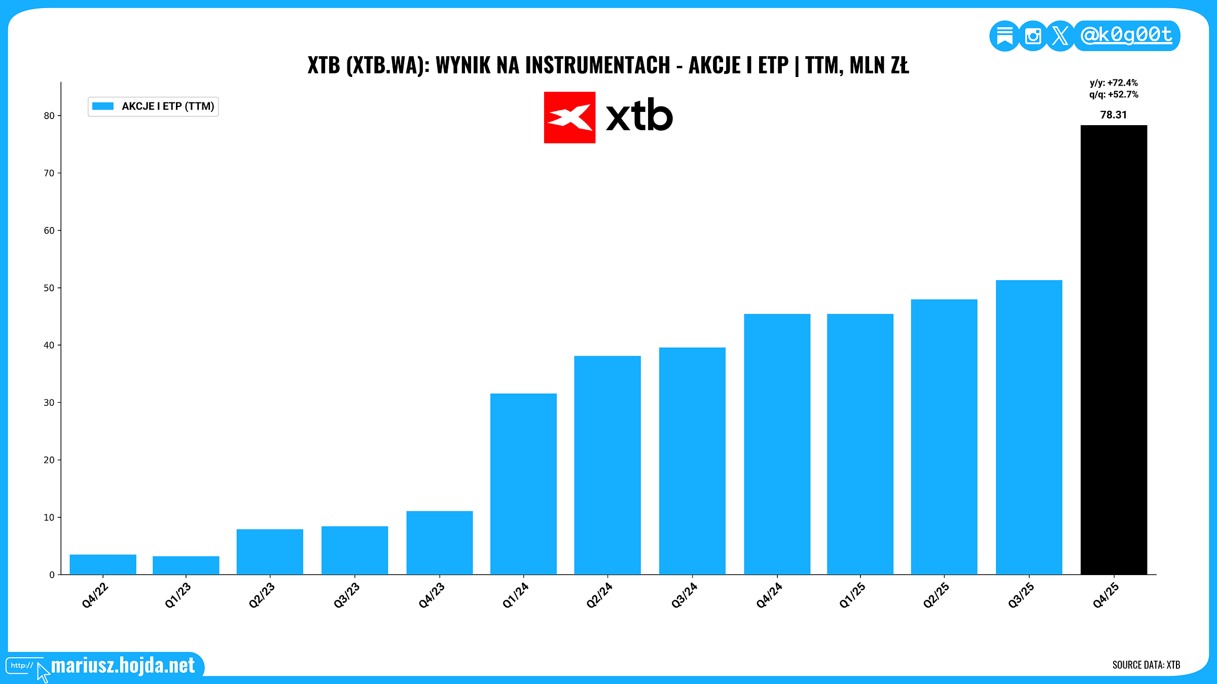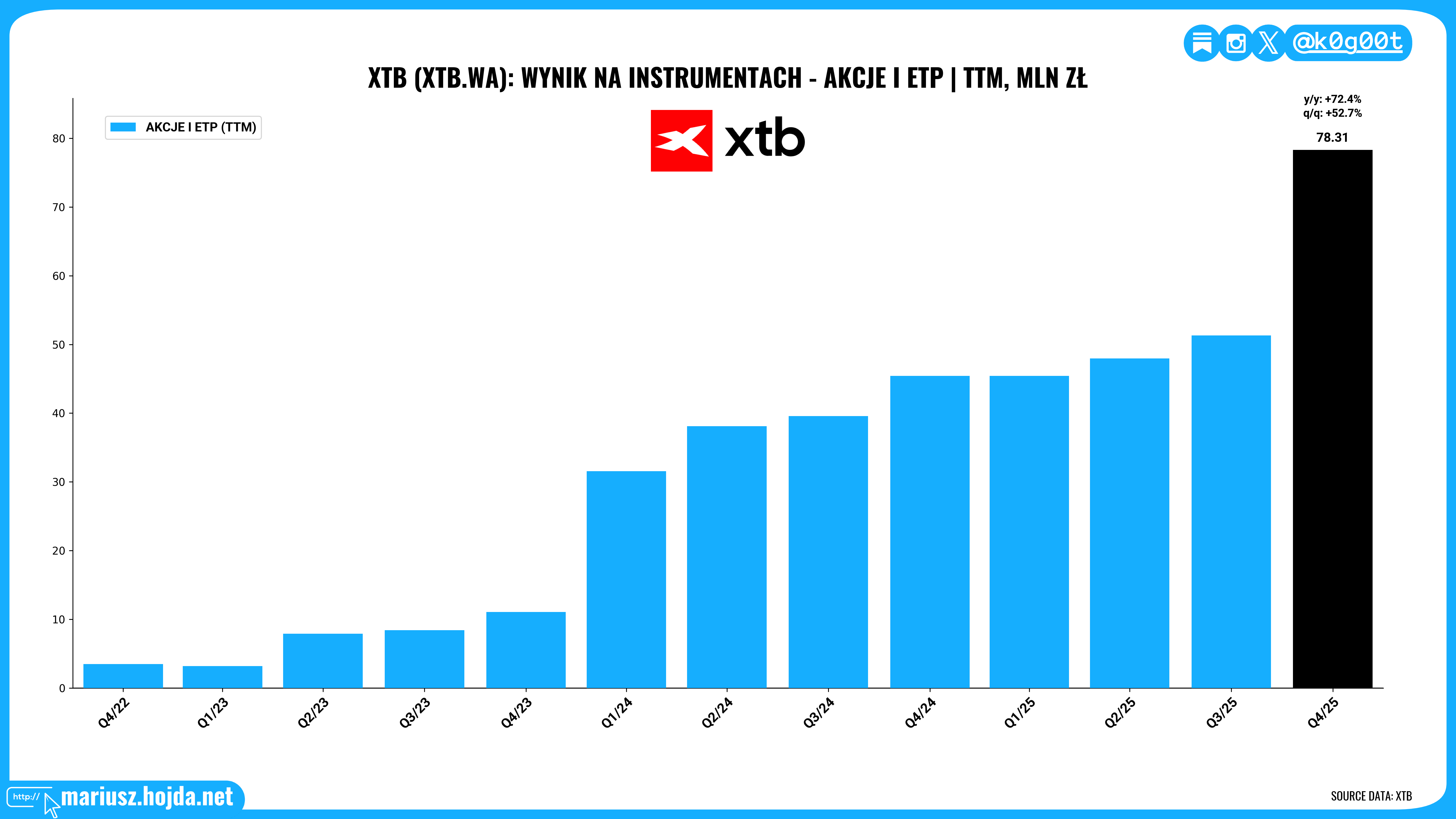 Widać to też już po samych danych raportowanych przez XTB. Wynik na instrumentach - Akcje i ETP urósł w 2025 do 78,3 mln zł z 30,7 mln zł rok wcześniej. Czyli ten kawałek biznesu rośnie szybko, ale nadal nie jest rdzeniem całej spółki. W 2025 odpowiadał za około 3,7% całego wyniku na instrumentach w XTB, a w samym 4Q25 ten udział był już wyższy i wynosił około 6,1%.