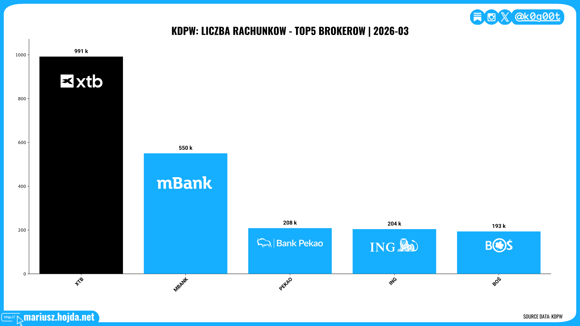 KDPW pokazał nowe dane. XTB jest już naprawdę o krok od symbolicznego 1 mln rachunków. Na koniec marca broker miał 991,8 tys. rachunków w rejestrze KDPW.