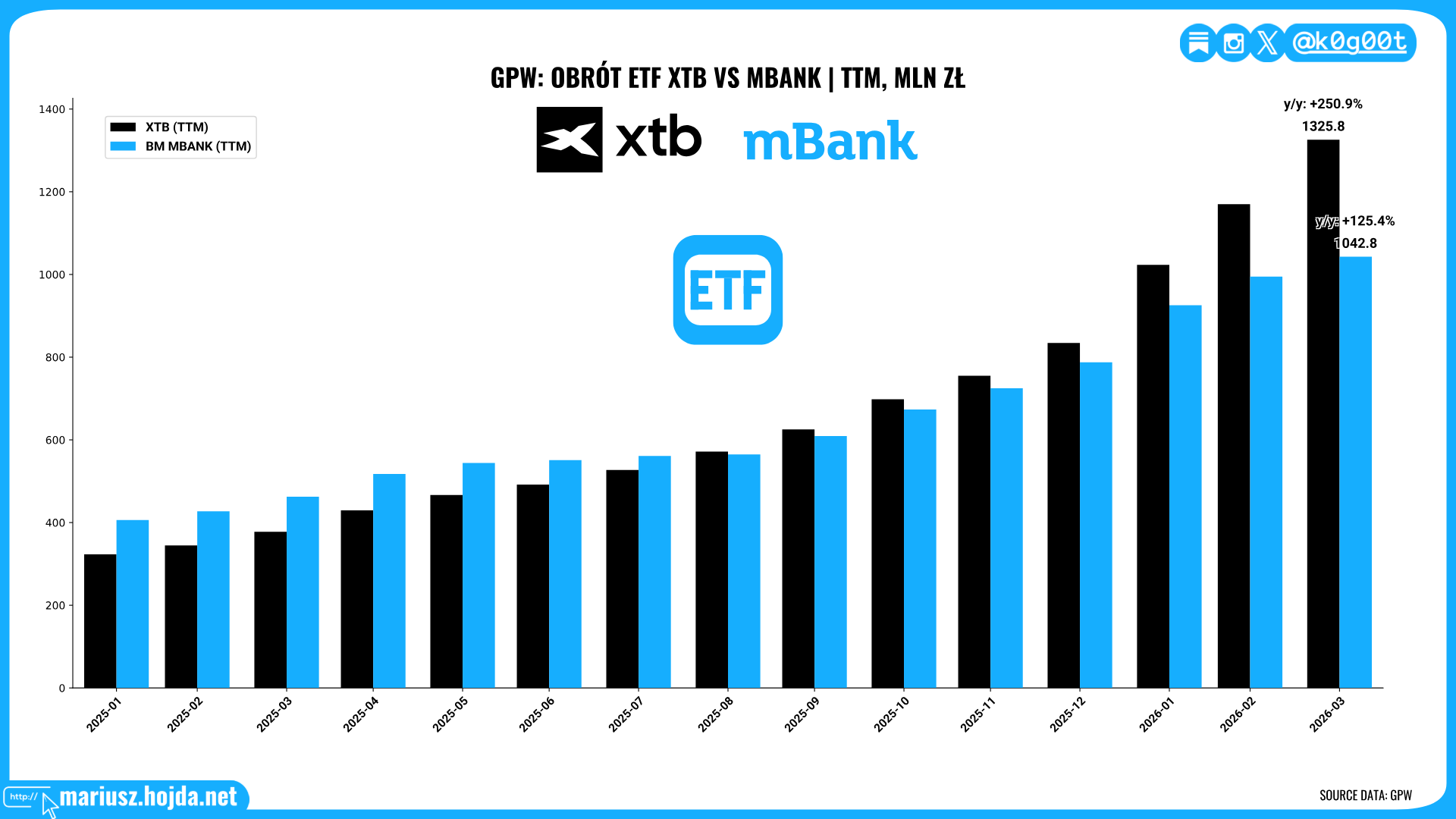 Na ETF-ach obraz się odwraca: XTB ma 1,33 mld zł obrotu TTM wobec 1,04 mld zł w mBanku.