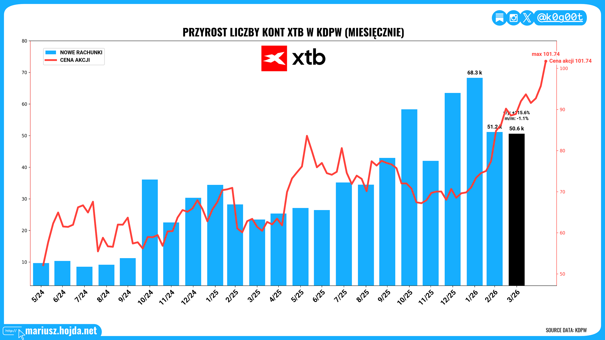 I to jest właśnie ten moment, w którym sama liczba przestaje być tylko tabelką. Zaczyna żyć własnym życiem i rynek też zaczyna to grać. W marcu XTB dołożyło 50,6 tys. rachunków, a kurs akcji wrócił na ATH.