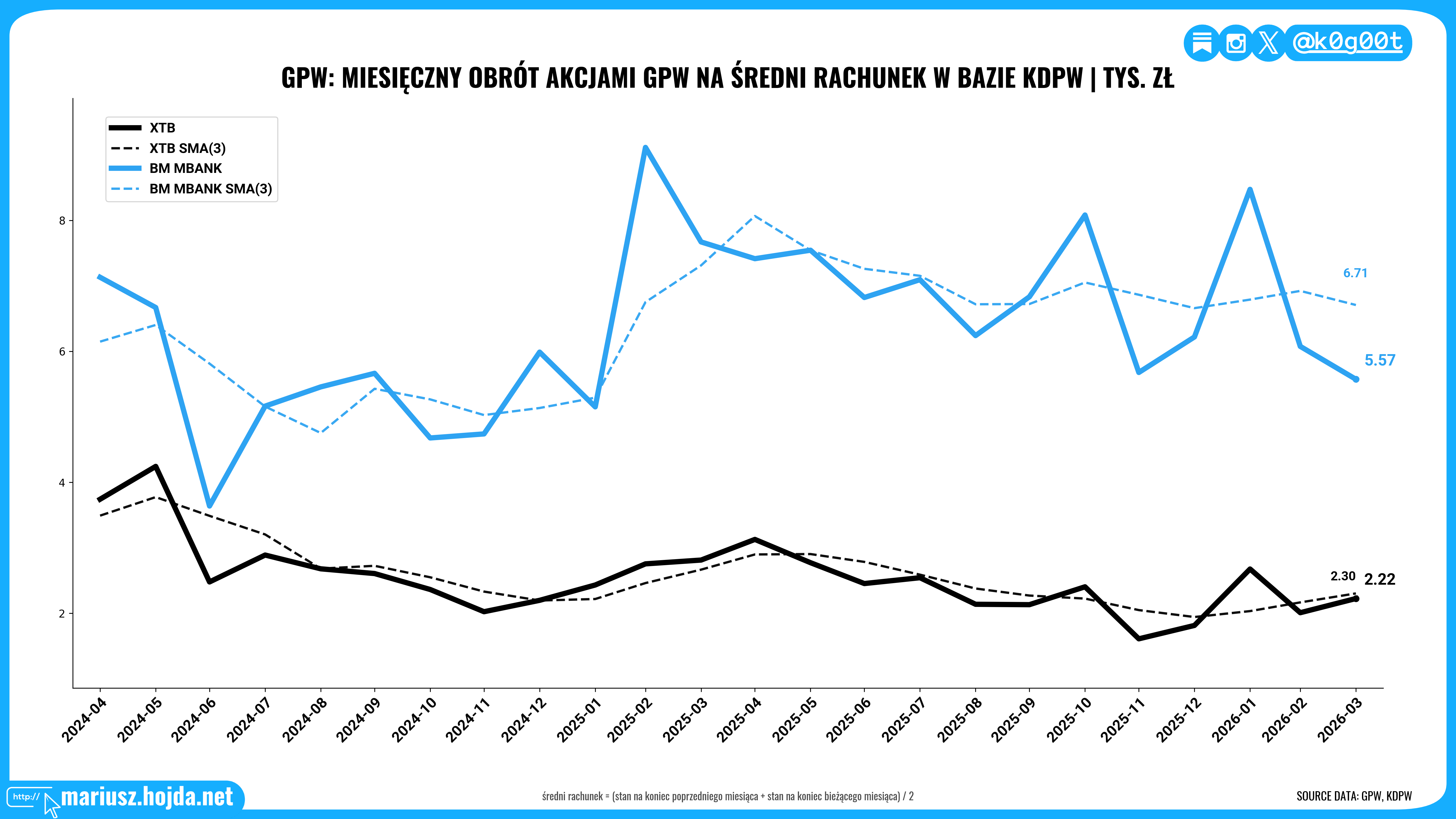Tu oczywiście trzeba uważać z interpretacją. To nie znaczy, że „średni klient XTB handluje tylko za 2,2 tys. zł”. To nie jest obrót na aktywnego klienta, tylko obrót podzielony przez średnią liczbę rachunków w bazie KDPW. Czyli w mianowniku masz też rachunki świeżo otwarte, mniej aktywne albo takie, które nie służą głównie do handlu akcjami na GPW.