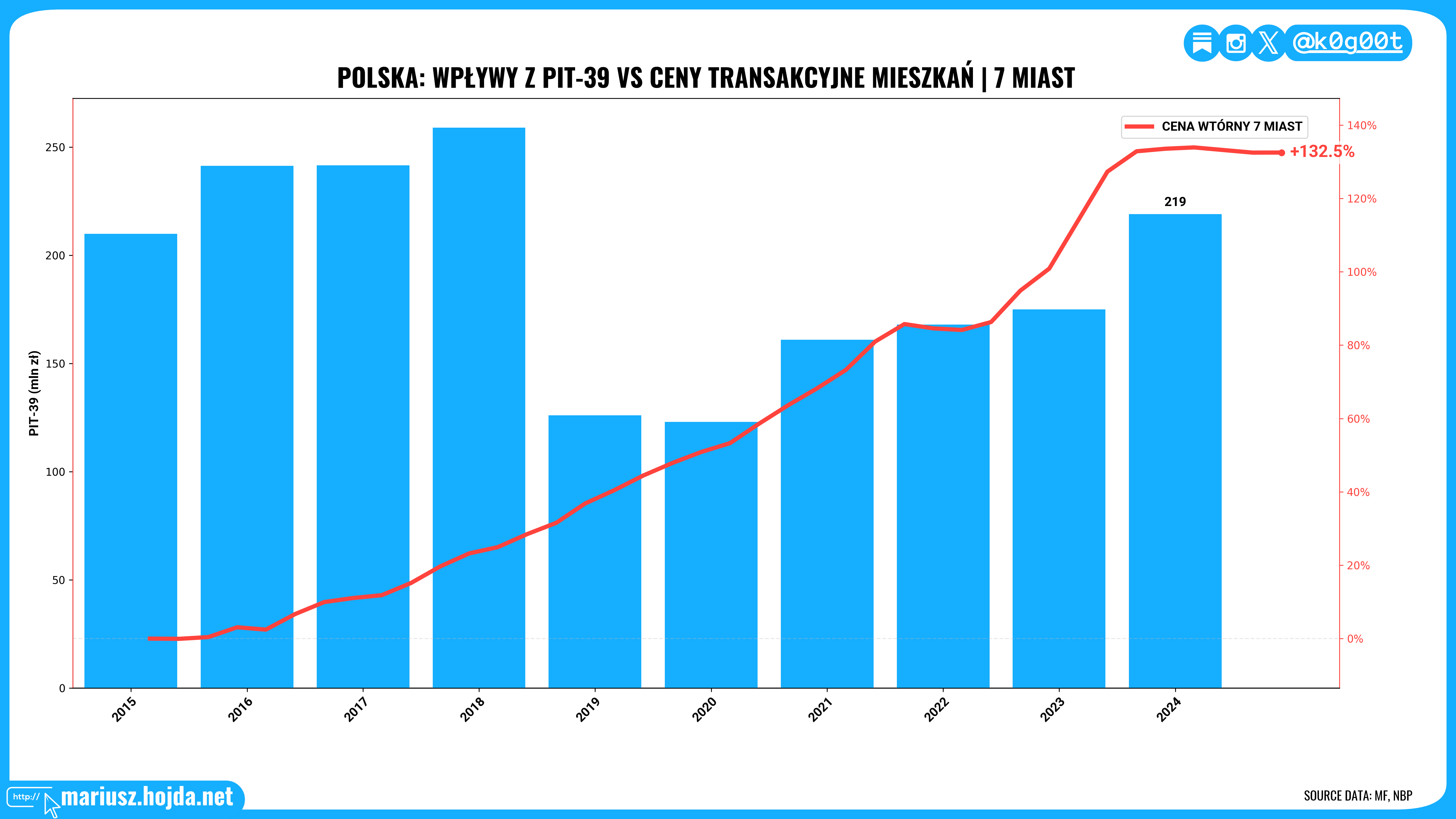 Najlepiej widać to w latach 2019-2020. Ceny transakcyjne mieszkań dalej rosły, a PIT-39 mocno spadł. To jest właśnie moment, w którym widać, że ten podatek nie jest „indeksem cen mieszkań”, tylko raczej podatkiem od specyficznego wycinka rynku.