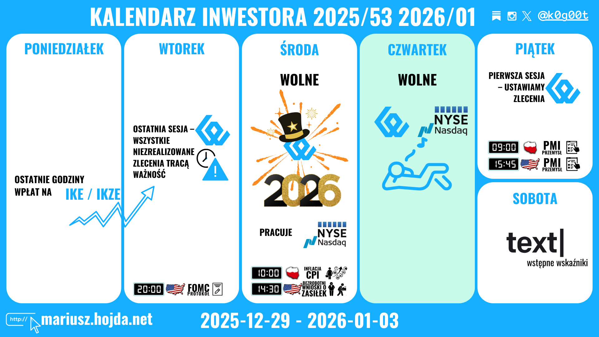 Wieczorem z USA dostaniemy protokół z grudniowego posiedzenia FOMC (Fed minutes) – rynek będzie czytał między wierszami pod 2026 r.Środa–czwartek – Nowy Rok i przerwa w handlu