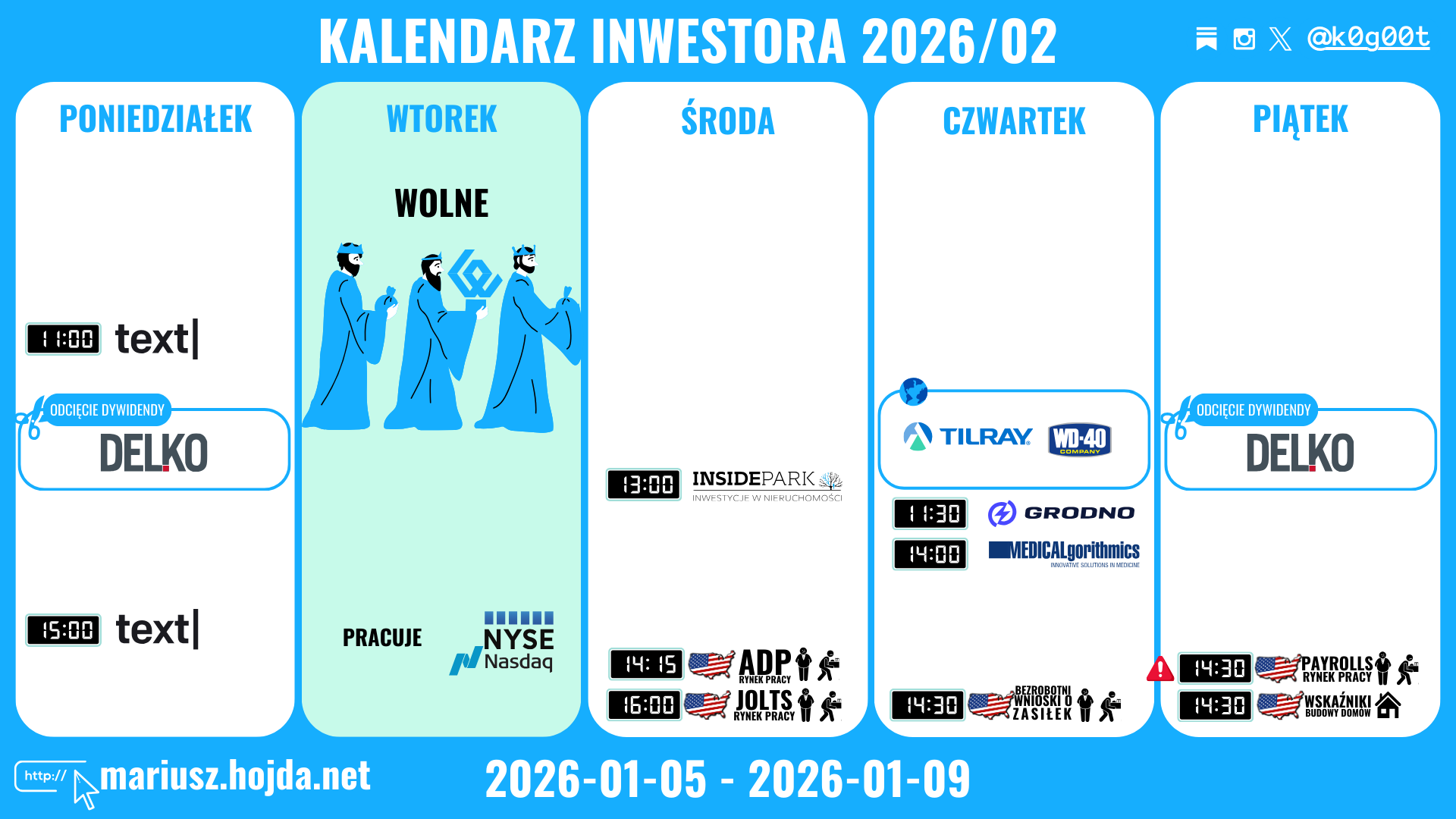 Konferencja Text + start tygodnia na GPW. Delko pierwszy raz odcina dywidendę.Wtorek (Trzech Króli)