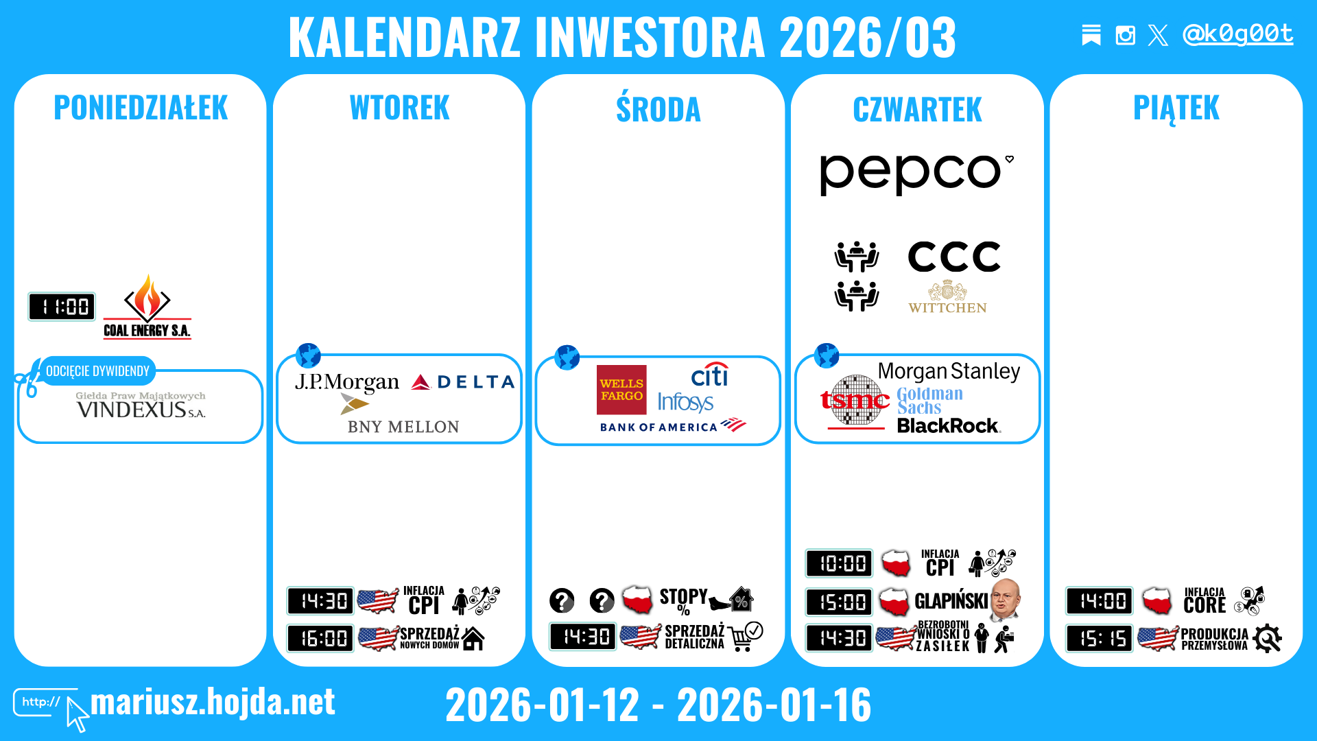 Drugi pełny tydzień stycznia przynosi już konkretne decyzje i twarde dane. W centrum uwagi Polska i USA, a w tle start sezonu wyników na Wall Street oraz intensyfikacja roadshow spółek.