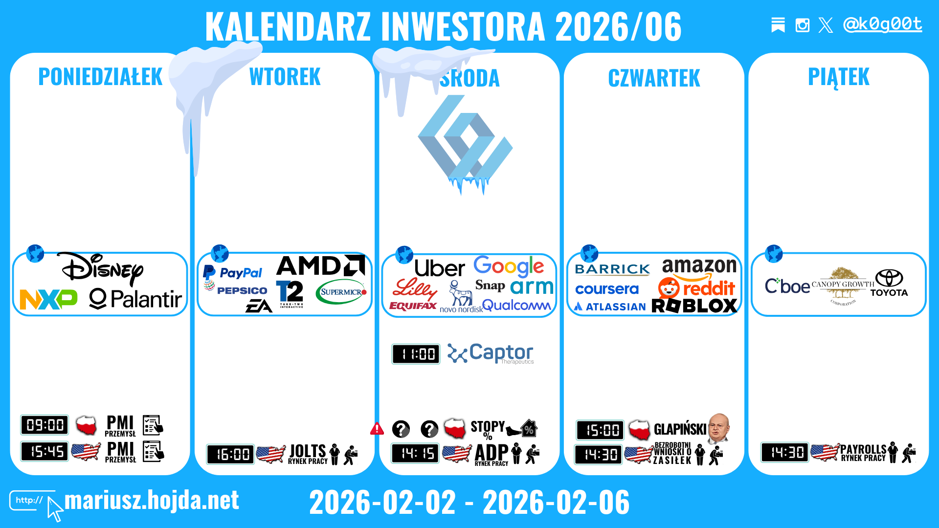 Poniedziałek (02.02): Disney, NXP, Palantir → konsument + półprzewodniki + AI narracja.
