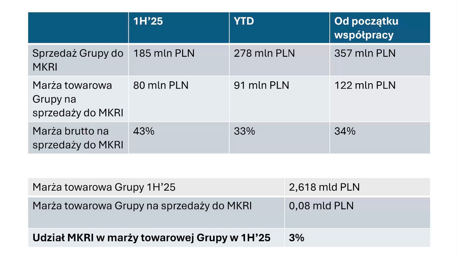 W pierwszym półroczu 2025 roku sprzedaż do MKRI wyniosła 185 mln PLN przy 80 mln PLN marży towarowej. Udział MKRI w całkowitej marży towarowej Grupy w tym okresie to zaledwie 3%.[1][3]