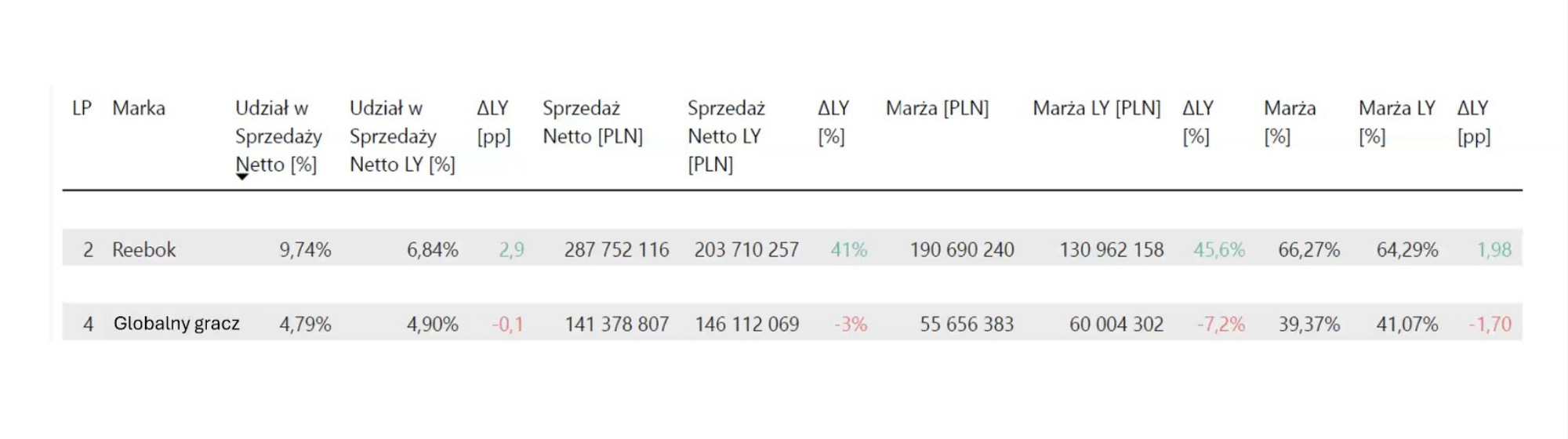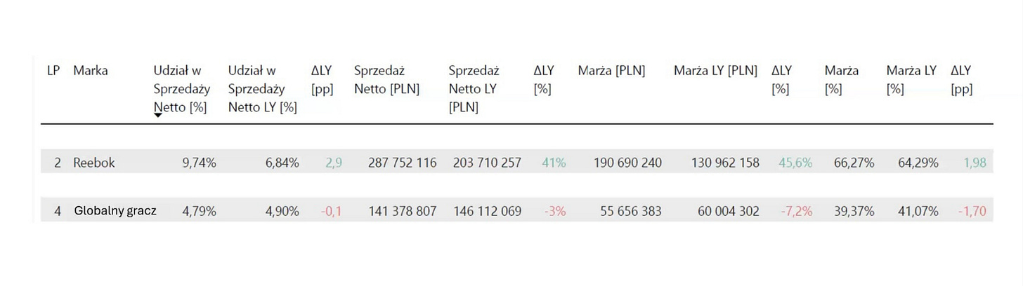 Sprzedaż netto produktów Reebok wyniosła 287,7 mln PLN, generując 190,7 mln PLN marży.[1]
