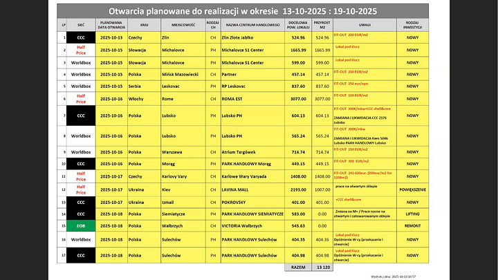 Całoroczny plan zakłada otwarcie 325 800 m² nowej powierzchni, z czego do połowy października zrealizowano niemal 160 000 m² (49%).[1]