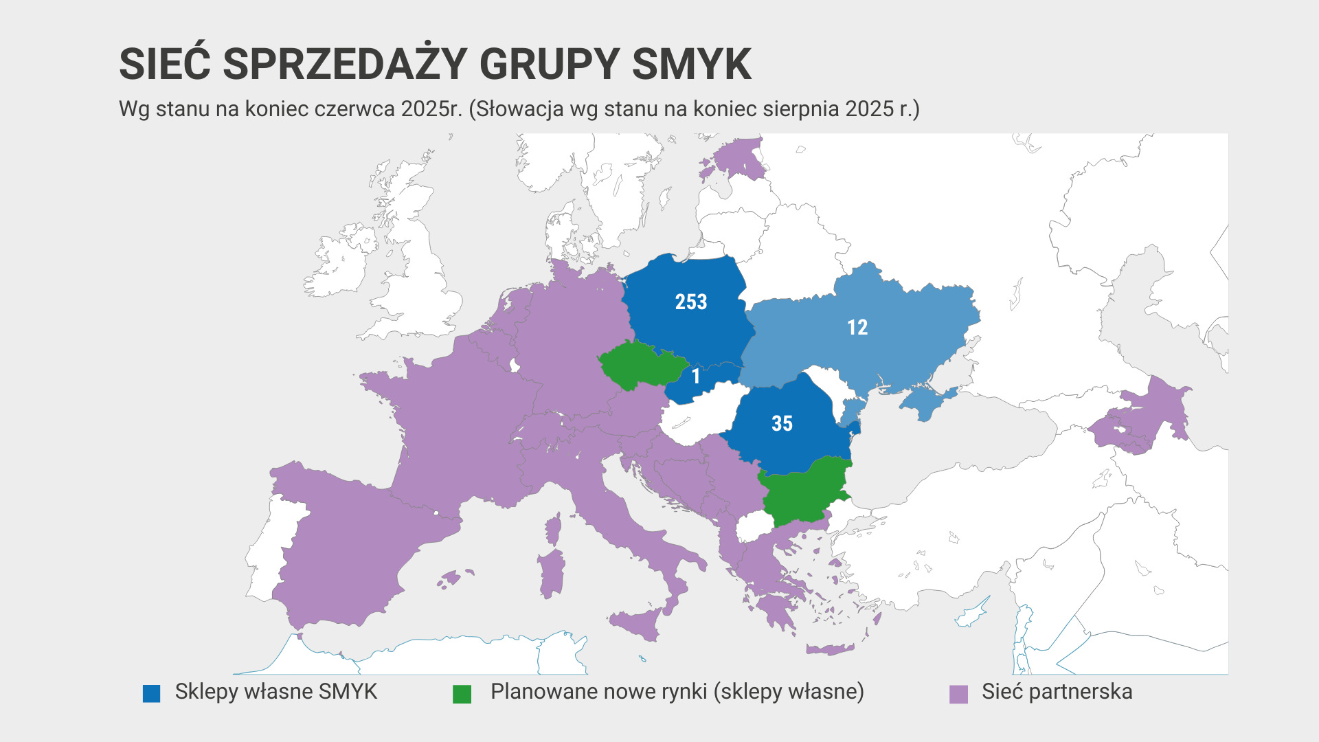 Smyk jest liderem polskiego rynku produktów dla dzieci z 14,3% udziałem w rynku docelowym (odzież dziecięca, zabawki i akcesoria), co stanowi wzrost z 11,6% w 2020 roku. Spółka prowadzi 253 sklepy w Polsce i 35 w Rumunii (stan na koniec czerwca 2025 r.). We wrześniu 2025 roku Smyk otworzył pierwszy sklep w Słowacji, a w planach są ekspansje do Czech i Bułgarii – łącznie 8 sklepów na tych trzech rynkach do końca 2026 roku.[2][1]