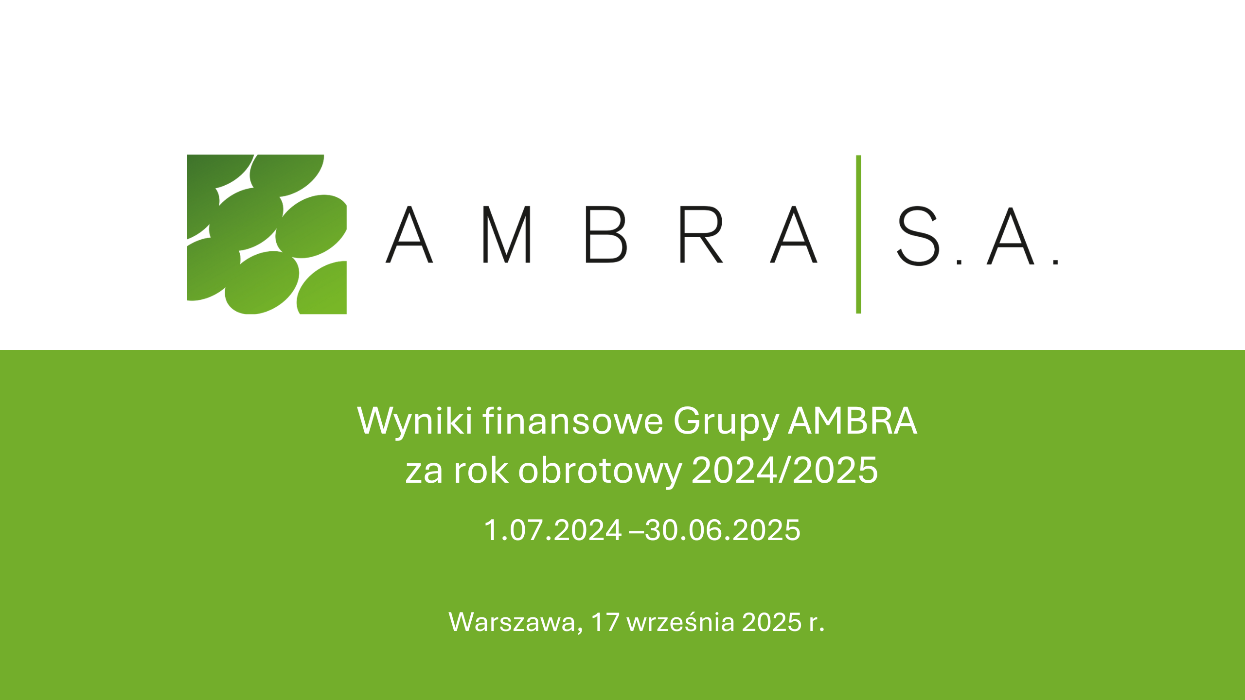 W dniu 17 września 2025 roku odbyła się konferencja online z zarządem Grupy Ambra, poświęcona prezentacji wyników finansowych za rok obrotowy 2024/2025, zakończony 30 czerwca 2025 roku. Spółkę reprezentowali Prezes Zarządu, Robert Ogór, oraz Wiceprezes Zarządu ds. Finansowych, Piotr Kaźmierczak. Celem spotkania było omówienie kluczowych danych finansowych, strategicznych kierunków rozwoju oraz odpowiedzi na pytania analityków i inwestorów w kontekście wyzwań rynkowych.[1]