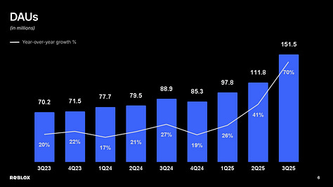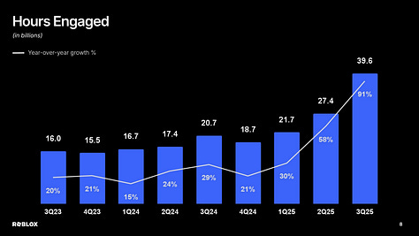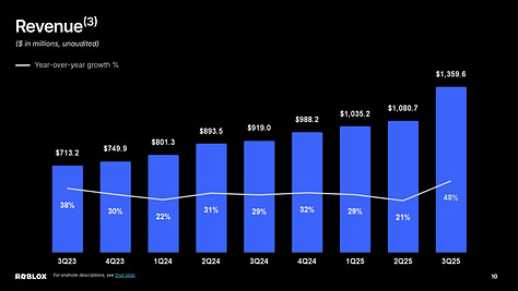 W trzecim kwartale 2025 roku Roblox odnotował znaczące wzrosty kluczowych wskaźników operacyjnych i finansowych. Zarząd podkreślił, że platforma i ekosystem twórców są w najlepszej kondycji w historii.[1]