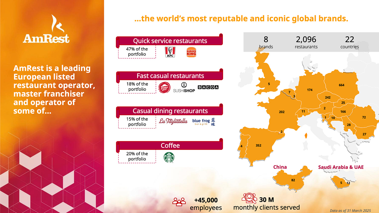 AmRest Holdings SE (AmRest) jest wiodącym operatorem restauracyjnym w Europie, zarządzającym portfelem blisko 2100 restauracji w 22 krajach Europy, Bliskiego Wschodu i Chin. Spółka posiada zdywersyfikowany portfel marek franczyzowych i własnych, obsługując miesięcznie ponad 30 milionów klientów dzięki pracy ponad 45 000 pracowników. Celem konferencji, która odbyła się 9 maja 2025 roku, było przedstawienie wyników finansowych za pierwszy kwartał 2025 roku oraz omówienie kluczowych aspektów działalności i strategii firmy[1].