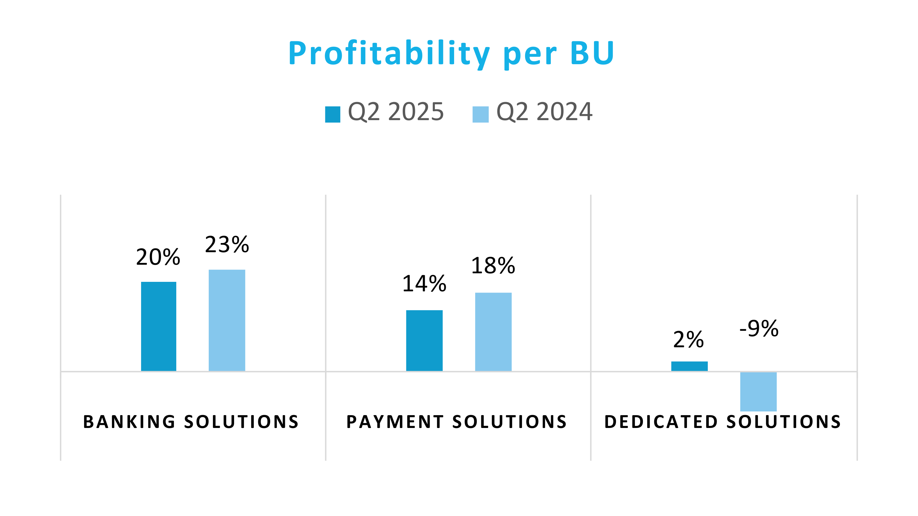 Segmenty biznesowe: W drugim kwartale największą poprawę rentowności odnotował segment rozwiązań dedykowanych, którego EBIT wzrósł o 3,0 mln euro r/r[2]. Zarząd spodziewa się kontynuacji tego trendu w drugim półroczu, zwłaszcza w Serbii i Bośni i Hercegowinie[1]. Segment płatności zanotował wzrost przychodów o 8,8 mln euro, jednak jego zysk operacyjny spadł o 0,7 mln euro z powodu odpisów w Indiach i utraty dużego klienta w Turcji, który przeszedł na własne rozwiązanie[1][2]. Segment bankowy pokazał stabilne wyniki, lepsze od oczekiwań, głównie dzięki wdrożeniom systemów typu core banking[1].