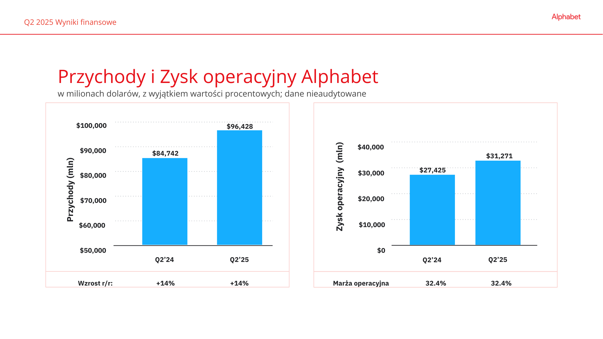 Drugi kwartał 2025 roku był dla Alphabet rekordowy, z dwucyfrowym wzrostem przychodów w kluczowych obszarach, takich jak wyszukiwarka Google, YouTube, subskrypcje oraz usługi chmurowe[2].