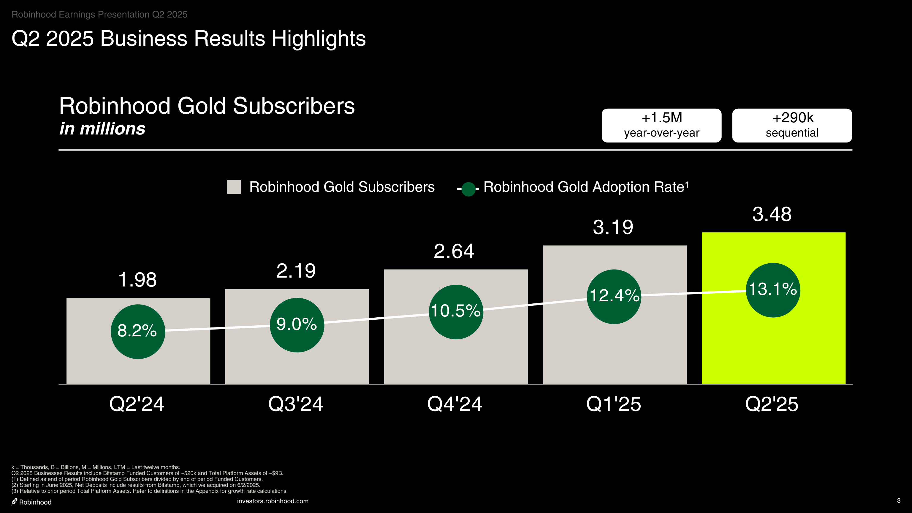 Subskrybenci Robinhood Gold osiągnęli rekordową liczbę 3,5 miliona, co stanowi wzrost o 75% rok do roku. Stopa adopcji wśród nowych klientów przekroczyła 35% [1][2].
