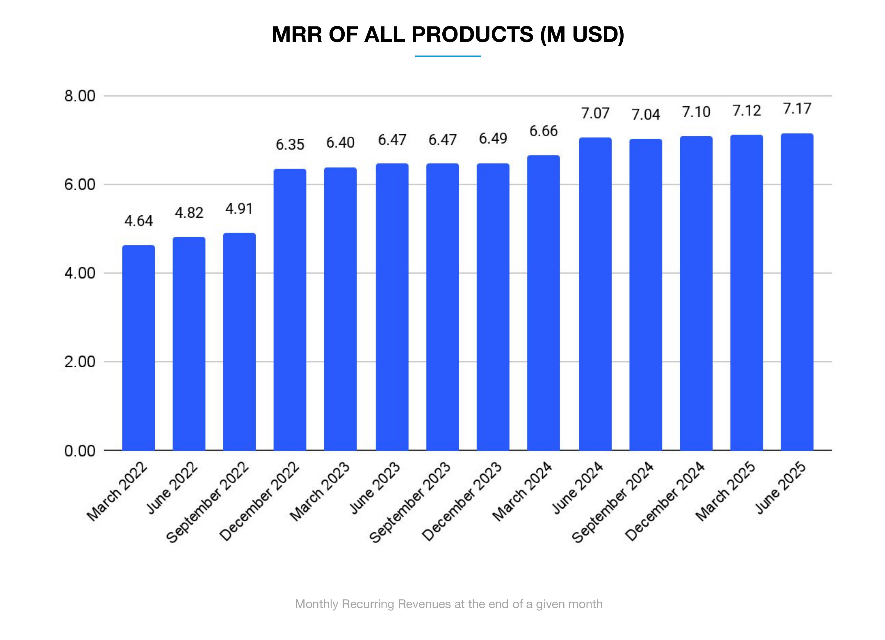 Miesięczne powtarzalne przychody (MRR): 7,17 mln USD, co oznacza wzrost o 1,4% r/r. Zarząd określił obecne tempo wzrostu jako "niezadowalające" [1].