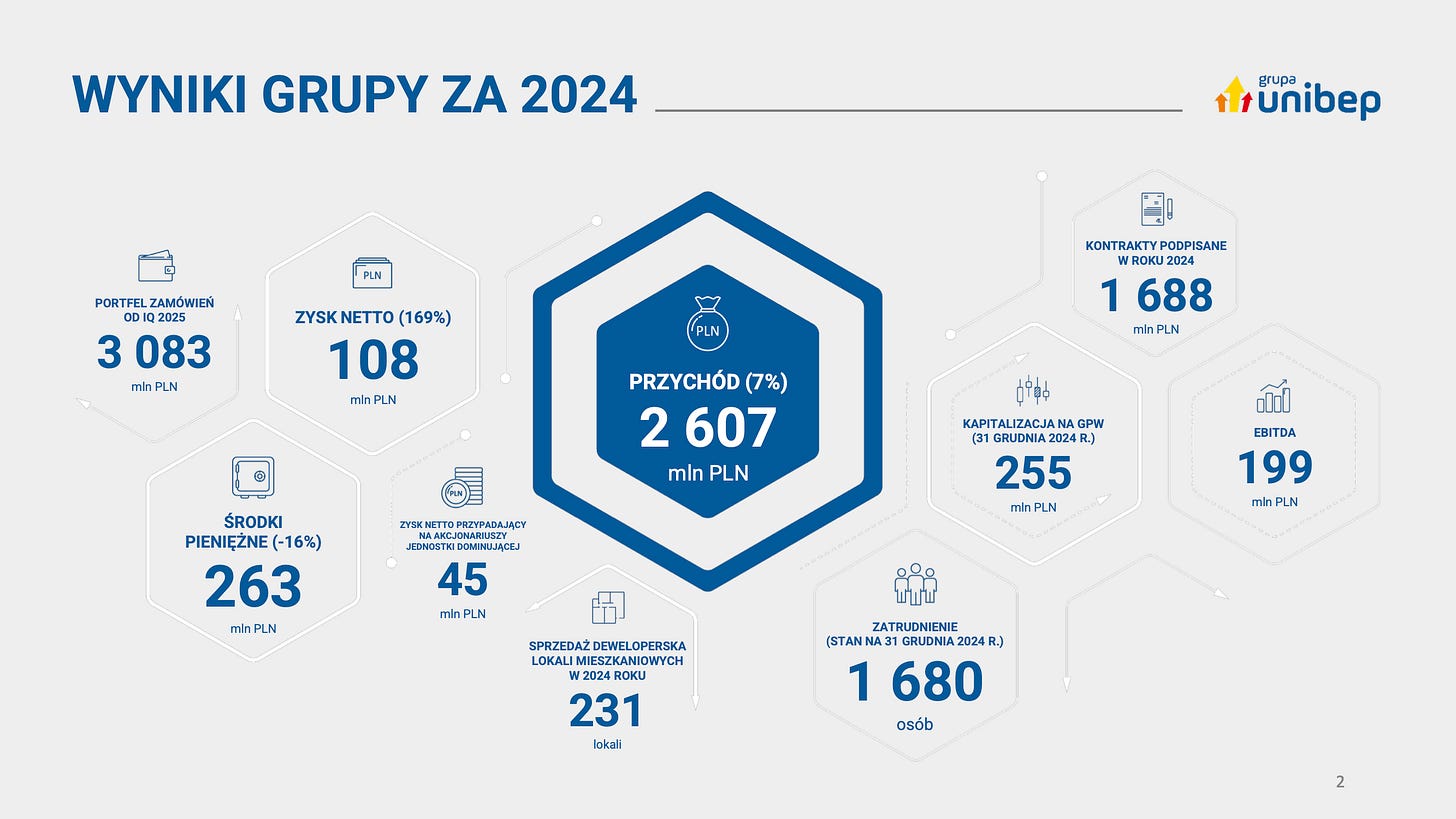 Grupa Unibep SA, działająca w różnych segmentach rynku budowlanego (budownictwo kubaturowe, energetyczno-przemysłowe, infrastrukturalne, modułowe – Unihouse SA, działalność deweloperska – Unidevelopment SA), zorganizowała konferencję w celu omówienia wyników finansowych za rok 2024 oraz przedstawienia perspektyw na kolejne okresy[1][2]. Spółka podkreśla swoje 75-letnie doświadczenie i obecność w kluczowych obszarach budownictwa w Polsce oraz na wybranych rynkach zagranicznych[1].
